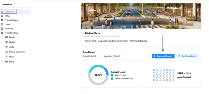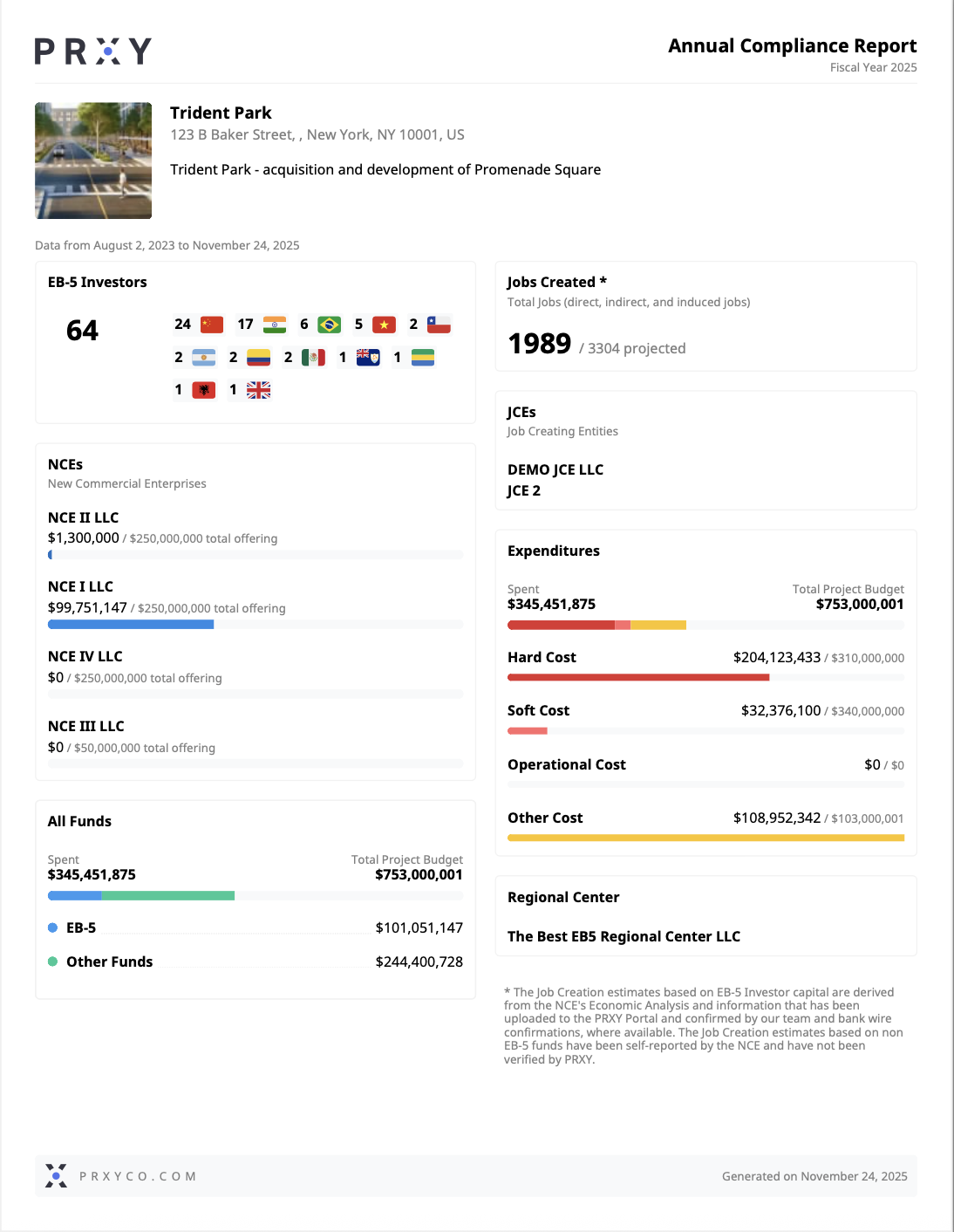 The PRXY Report is available for download in your Dashboard. Simply click ‘Download Report’ for an overview of the project to-date. The report includes essential, high-level information about your project including project details, investor nationality, project and EB-5 spending, estimated job creation, etc.